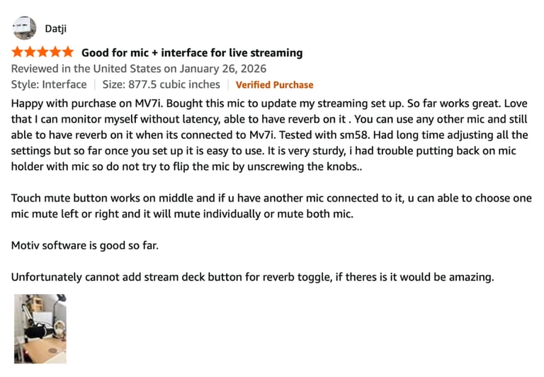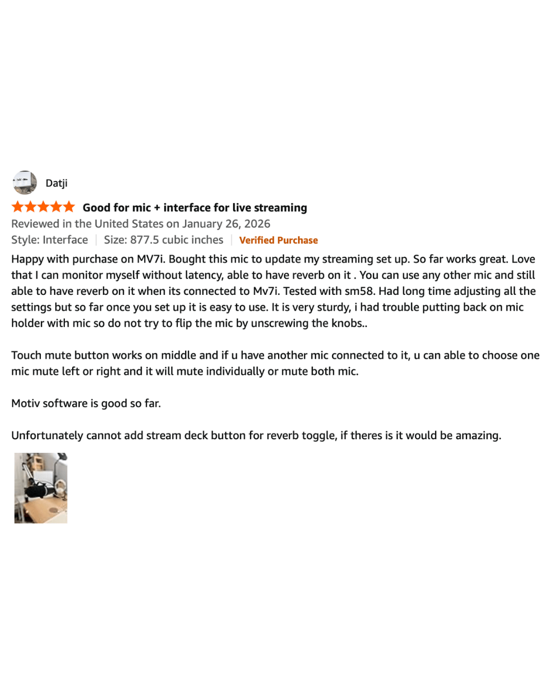Unlike condenser microphones that capture everything (including your neighbor's dog), the MV7's dynamic capsule naturally rejects off-axis noise. This means professional sound without acoustic treatment — a massive advantage for home studios.