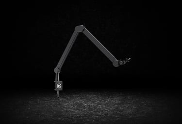 A premium low-profile microphone arm with hidden cable channels and smooth motion — the arm that disappears fro...