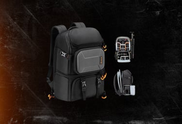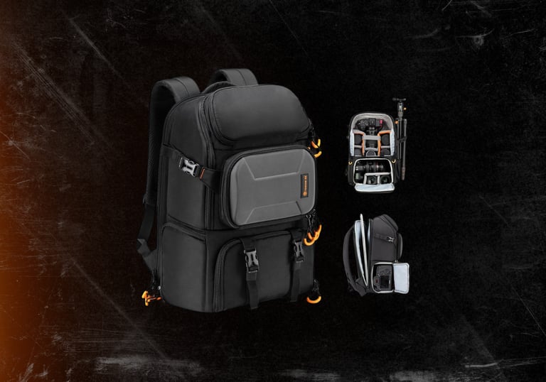 A compact, well-organized camera backpack with customizable dividers, rain cover, and comfortable carry...