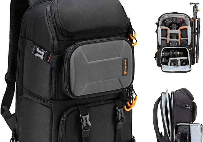 A compact, well-organized camera backpack with customizable dividers, rain cover, and comfortable carry...